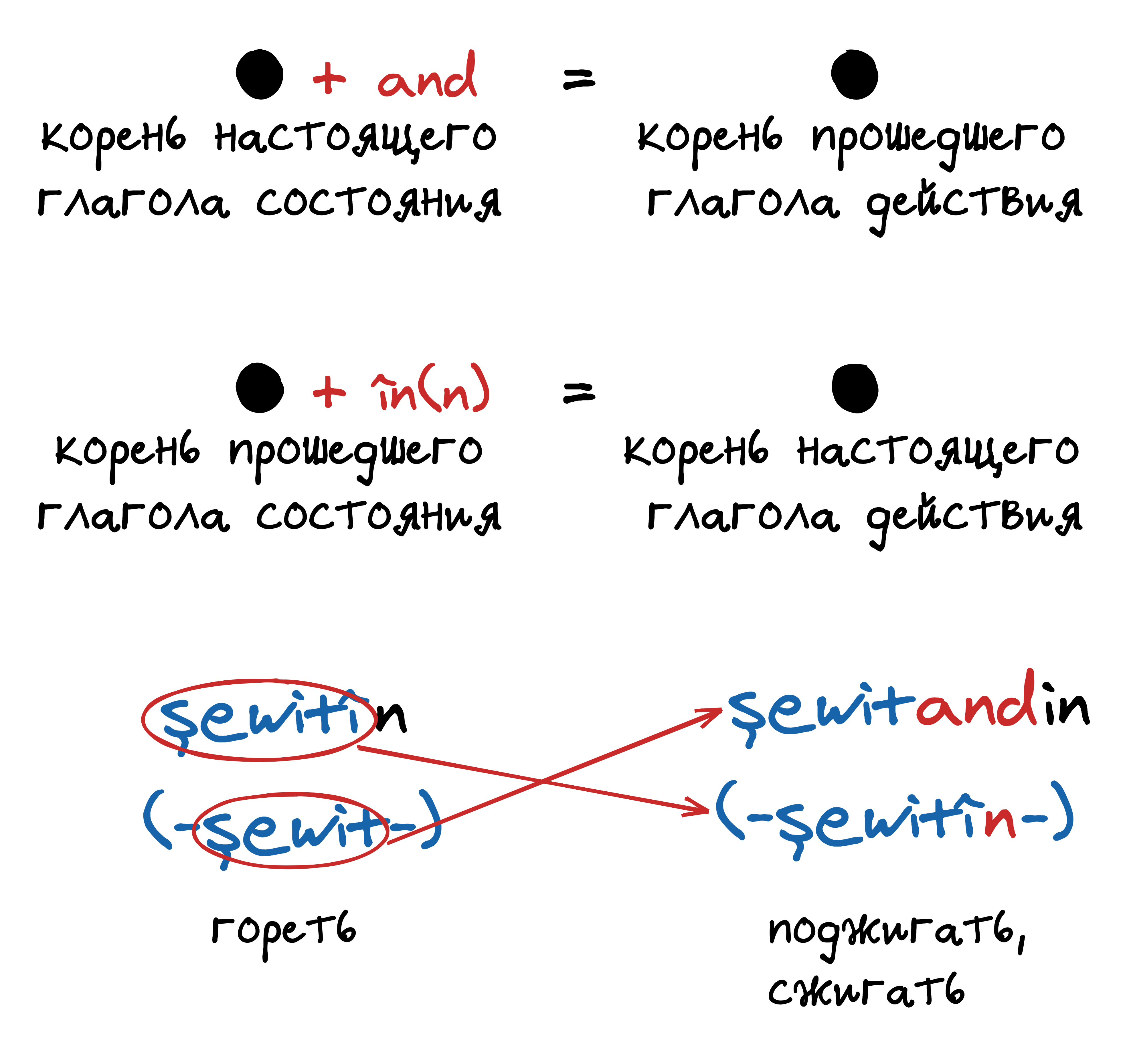 | şewitîn (-şewit-) гореть | ←→ | şewitandin (-şewitîn-) поджигать, сжигать |